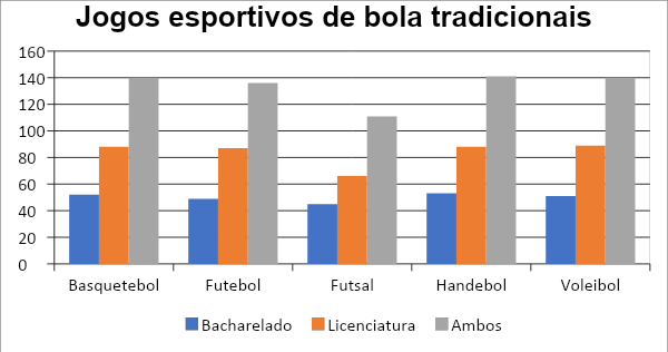 Segundo Canan (2020), os jogos esportivos de bola não dizem respeito a todo e qualquer jogo popular ou tradicional, mas sim, apenas àqueles que atendem aos requisitos necessários para que sejam considerados esporte. Para Parlebas (2001) e Barbanti (2006), o esporte tem como características, a prática motriz, o regramento escrito, a competição e a institucionalização. Os jogos esportivos de bola, dentre as várias modalidades esportivas, são os que condizem com as categorias supramencionadas, que apresentam como elementos comuns: a presença de uma bola (ou outro objeto de disputa entre os participantes), a interação com o adversário e/ou acerto ao alvo, e o lúdico. Assim, como colocam para Canan (2020) e Ramírez Torrealba (2013), jogos esportivos de bola são, essencialmente, jogos institucionalizados de bola.